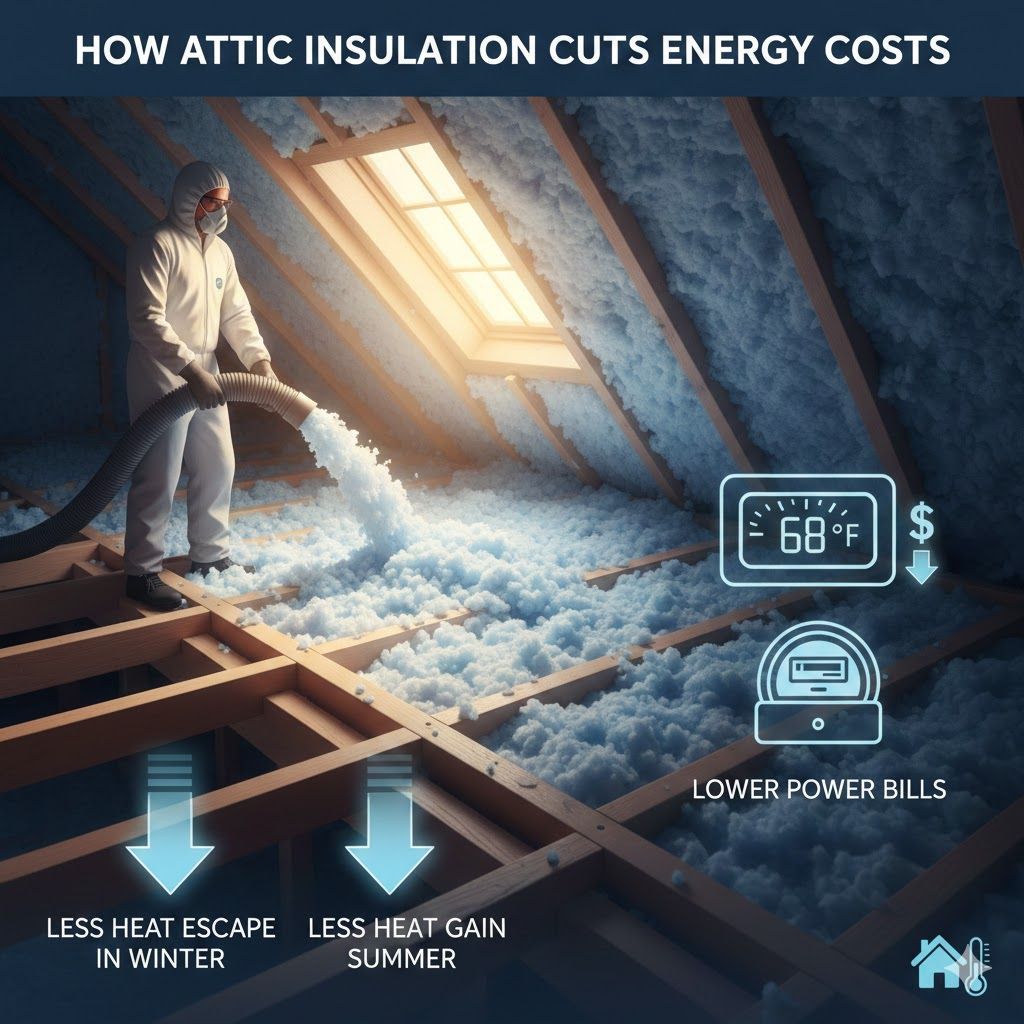 Attic insulation is one of the most cost‑effective ways to cut heating and cooling costs because it slows the movement of heat between your home and the outdoors, which means your HVAC system runs less and uses less power. When sized and installed correctly, attic insulation can trim typical heating and cooling bills by around 10–20%, depending on the home, climate, and existing insulation levels.